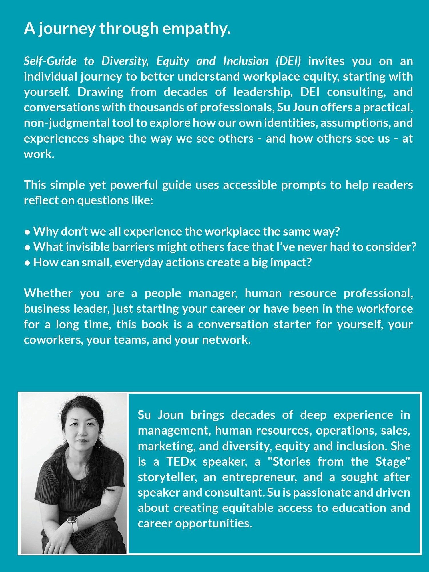 With decades of experience in management in multiple industries, human resources, and DEI consulting, Su Joun has listened to thousands of people share what inequity and equity looks and feels like on the ground. This guide offers that insight via digestible prompts and questions that encourage self-awareness, empathy, and practical action.